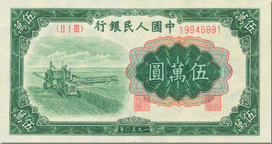 第一套人民币设计主景反映了当时解放区工农业生产的图景,题材多样,种类多、版面杂、面额差别大,带有明显的战时特征和时代过渡性。由于发行时战事仍然没有结束,以及后来一些资本家倒卖银元、生活用品等原因,第一套人民币通胀情况比较严重,从1948年12月到1950年1月,仅仅过了一年零两个月的时间,最大面额就从50元猛涨到10000元,之后在1953年底又发行了50000元。