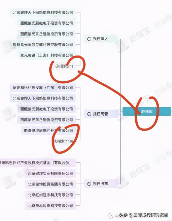 赵伟国当然是半导体芯片行业的资本狂人,公开资料显示,赵伟国在71家公司当然法人代表,在116家公司担任高管。