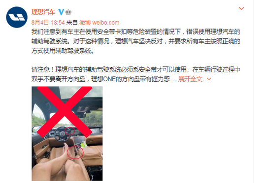 日前,还有理想车主上传了一段自己使用辅助驾驶系统躺着开理想ONE的视频,引发网友热议。8月4日下午,理想官方微博发文,称坚决反对这种行为,提示车主应按照正确的方式使用辅助驾驶系统。