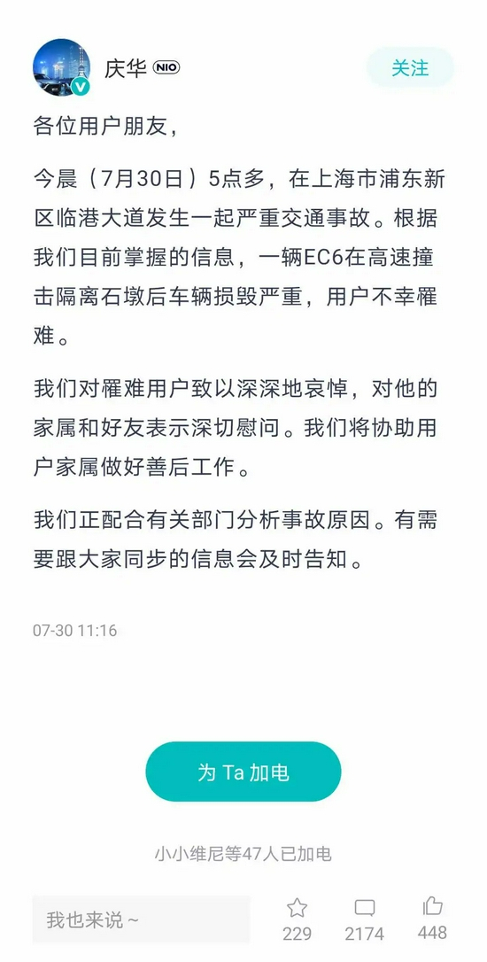 但事故发生后,蔚来汽车厦门区域公司总经理张波在蔚来APP中表态称,“我们正配合当地交警等有关部门进行事故调查,并将协助用户家属做好善后工作。”