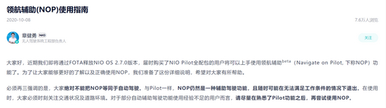 2020年10月,蔚来无人驾驶系统工程部负责人章健勇在蔚来APP上发布《领航辅助(NOP)使用指南》,文中写道: