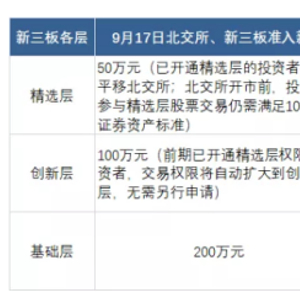 另外,全国股转公司修改了《全国中小企业股份转让系统投资者适当性管理办法》,将新三板创新层投资者准入资金门槛由150万元调整为100万元,并于2021年9月17日发布实施。新三板各层的准入规则变化如下: