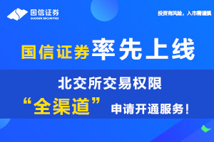 国信证券率先上线了“全流程、一站式”北交所交易权限“全渠道”申请开通服务!不同于一般的预留手机号方式,“全流程”开通可“一站式”提交开通申请,以客户需求为导向,让投资者体验“一步到位”的服务体验。今天小编就来和大家介绍下北交所交易业务究竟意味着什么?