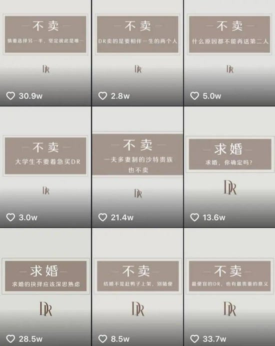 官网资讯栏写道:婚姻要经历求婚、订婚的过程,而求婚是必不可少的,一枚DR求婚戒才能开启婚姻大门。按照DR的逻辑,没有求婚钻戒的男女,是不是一生只配在婚姻的门外徘徊?