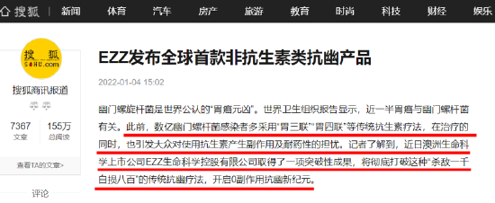 此前,数亿幽门螺杆菌感染者多采用“胃三联”“胃四联”等传统抗生素疗法,在治疗的同时,也引发大众对使用抗生素产生副作用及耐药性的担忧。根据权威媒体的最新报道,近日澳洲生命科学上市公司EZZ生命科学控股有限公司取得了一项突破性成果,将彻底打破这种“杀敌一千自损八百”的传统抗幽疗法,开启0副作用抗幽新纪元。