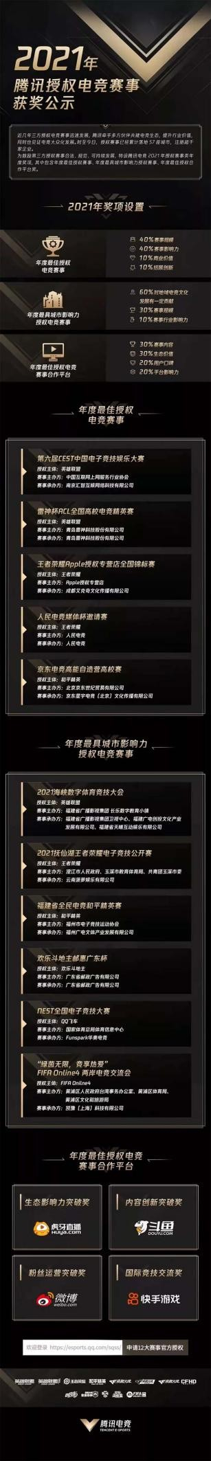 有了这套相对完善的系统以后,下一步就是对其使用的推广——只有这套系统的社会覆盖面越广,大众办赛的市场才能更加规范。对此腾讯电竞2021年也出台了相应的激励机制,特设立‘年度最佳授权赛事’,‘年度最具城市影响力授权赛事’,以及‘最佳授权合作直播平台’,面向所有的授权赛事开放。