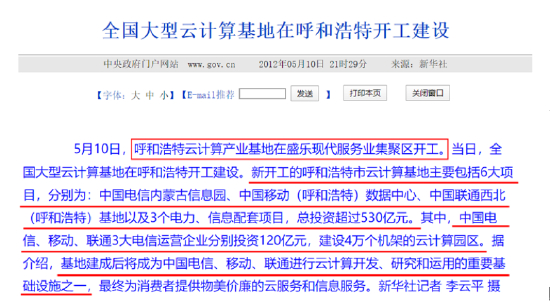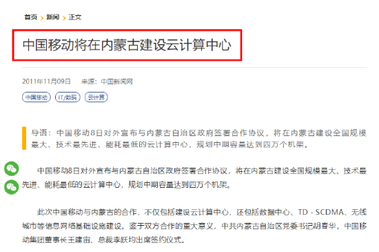 早在2011年11月,中国移动就对外宣布与内蒙古自治区政府签署合作协议,在内蒙古建设全国规模最大、技术最先进、能耗最低的云计算中心。具体地址位于内蒙古呼和浩特市和林格尔县盛乐现代服务业集聚区。