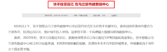 快手方面表示,公司超大规模数据中心——乌兰察布大规模数据中心位于“东数西算”内蒙古枢纽节点。按规划约建设两万个10千瓦机柜,全部完成后预计可支撑30万台服务器。