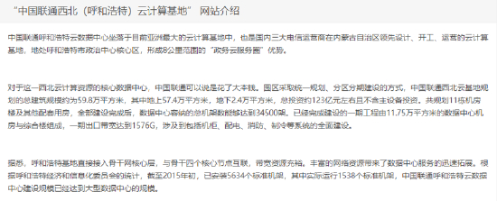 中国联通呼和浩特云数据中心坐落于目前亚洲最大的云计算基地中,也是国内三大电信运营商在内蒙古自治区领先设计、开工、运营的云计算基地,地处呼和浩特市政治中心核心区,形成8公里范围的“政务云服务圈”优势。中国联通西北(呼和浩特)基地项目计划投资123亿元,建成集云计算中心、呼叫中心、IDC数据中心等为一体的超大型项目,将成为国内最精致、最绿色、最先进的通信基地项目之一。