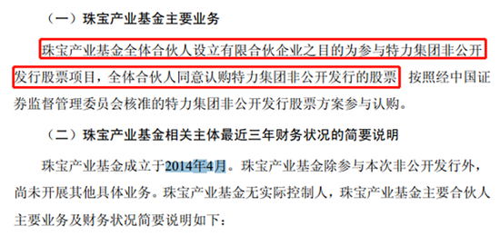 公告也毫不讳言,远致富海(公告中亦简称为“珠宝产业基金”)成立的目的就是为了参与特力A的增发。