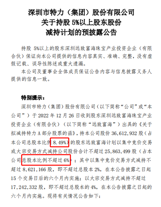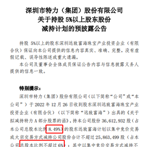 12月27日,特力A发布公告,公司于26日收到股东深圳远致富海珠宝产业投资企业(有限合伙)(以下简称“远致富海”)出具的《关于拟减持特力A部分股票的函》,远致富海计划在未来六个月内,以集中竞价交易或大宗交易方式减持特力A合计不超过6%的股份。