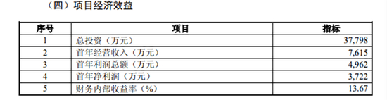 项目经济效益测算上,首年经营收入7615万元,首年净利润3722万元,财务内部收益率为13.67%。