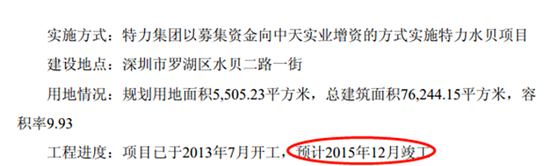 而回看彼时特力A的定增项目,则是一地鸡毛。根据可行性分析报告,特力水贝珠宝大厦项目预计2015年12月竣工。
