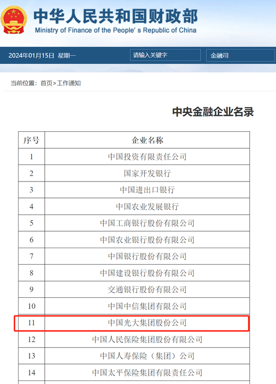 据财政部网站,光大集团位列中央金融企业名录。