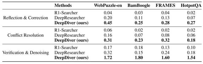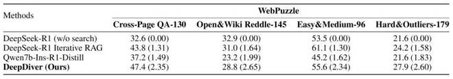 结果表明,在难以通过内部知识解决的问题上,DeepDiver 超越或匹敌所有基线模型,甚至包括 DeepSeek-R1。这证实了 DeepDiver 在 WebPuzzle 完整数据集上未能全面超越 671B 基线模型的主要原因,是参数规模而非检索能力限制。而对于检索能力本身而言,DeepDiver 则表现出了非常强大的能力,能够让 7B 模型与超大规模 LLM 性能相当。