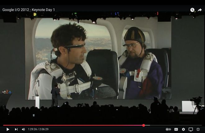 如此高规格,很难不让人想起 2012 年、同样是在 Google I/O 上发布的「上古级 AI 眼镜」Google Glass、彼时谢尔盖-布林佩戴着它,从飞机机舱内跳出同时全程直播,至今仍然是科技史上让人津津乐道的名场面。