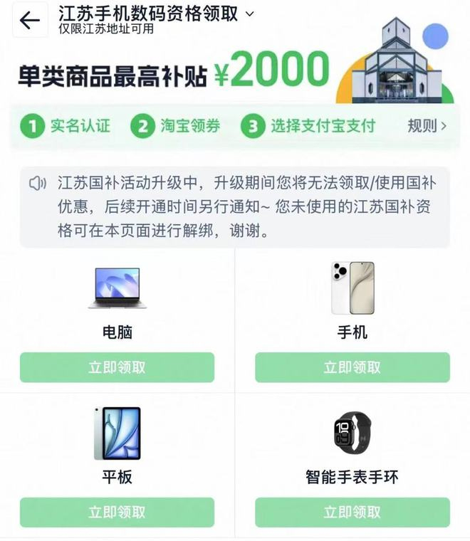 淘宝平台显示,江苏国补活动升级,期间无法领取国补优惠。