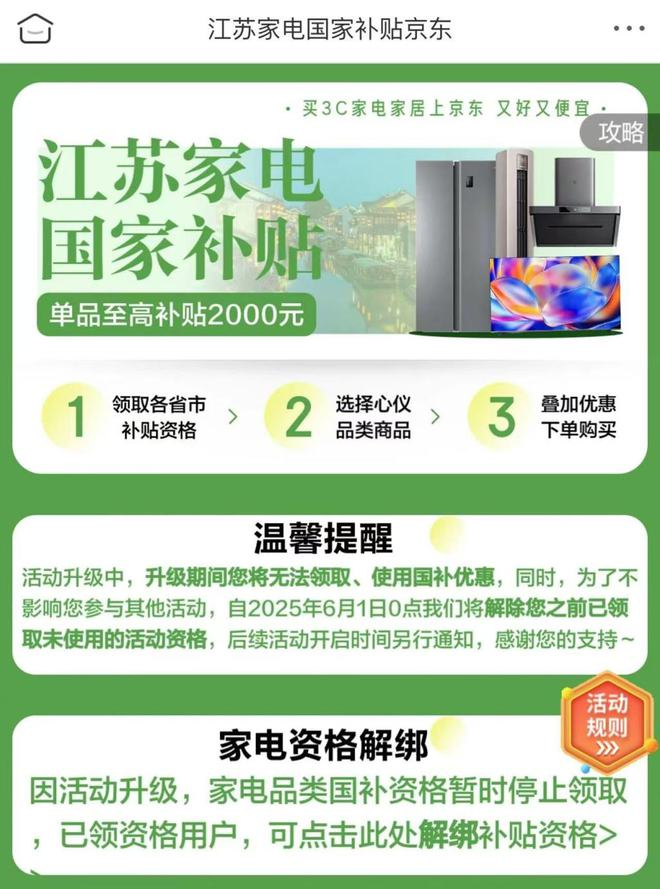 在京东“国家补贴”页面则显示:“江苏国家补贴活动2025年6月1日0时起,将进行资格平台升级,届时您将无法领取、使用您的国家补贴资格,已领取资格的用户如未下单使用,将会为您自动解绑资格,升级期间取消、售后退款的用户,资格返还后,您可前往江苏活动会场解绑资格。”