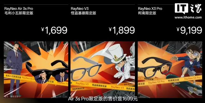 值得一提的是,作为发布会的 One More Thing 环节,这些新品都有名侦探柯南的联名限定版,包括 Air 3S Pro 毛利小五郎限定版、V3 怪盗基德定制版和 X3 Pro 的柯南限定款。