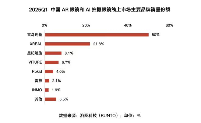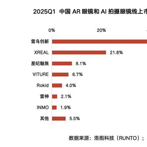 据市场调研机构洛图科技(RUNTO)发布的《中国 XR 设备零售市场追踪报告》显示,2025 年一季度,雷鸟创新在中国 AR / AI 拍摄眼镜线上市场以高达 50% 的份额实现断崖式领先,稳居行业第一。