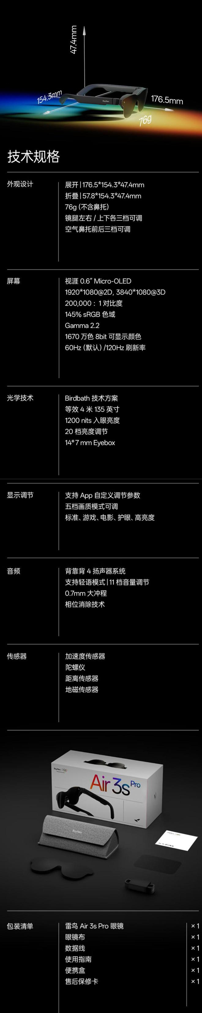 相较于标准版,雷鸟 Air 3s Pro 主要是新增了 3D 环绕音效系统,标配遮光前挡,并赠送充电转接器,而其定价仅为 1599 元,国补后到手价更是低至 1439.1 元。