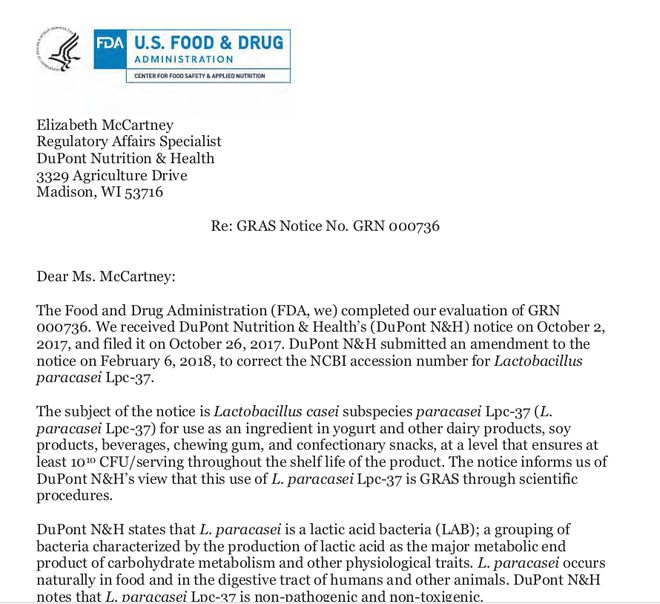 不过,科伦药业所引用的美国食药监局的发布的公认安全通知函中却并未提及麦角硫因。具体而言,这份通知函中是针对杜邦营养与健康公司提交的GRN 000736通知的评估回复,核心围绕副干酪乳杆菌Lpc - 37展开。