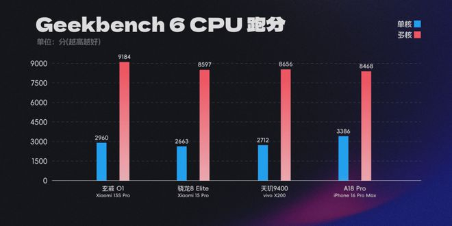 按我们之前测试的结果,这颗小米 15S Pro 玄戒 O1 在 Geekbench 6 的 CPU 跑分成绩跟骁龙 8 Elite 、 天玑 9400 和 A18 Pro 这些老牌选手打的有来有回,多核成绩更是一骑绝尘。