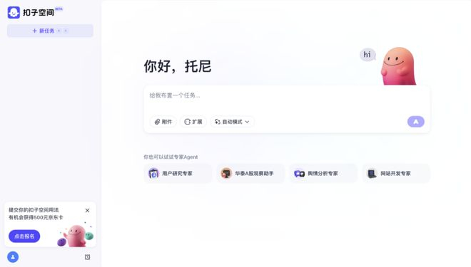 总之有啥收集信息、做报告、看资料的活儿,丢给它就行。操作简单又丝滑,只要打开扣子空间 ( coze.cn ),布置完任务,咱该吃饭吃饭,该开会开会去。