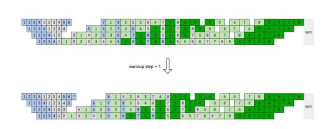 具体来说,他们通过将稳态的 1F1B stage 中第一个 micro batch 的 fprop 提前到 warmup stage,即 warmup step + 1,就可以在 interleaved 1F1B 实现 1F1B 稳态阶段不同 micro batch 前反向之间的 EP A2A 与计算的 overlap。