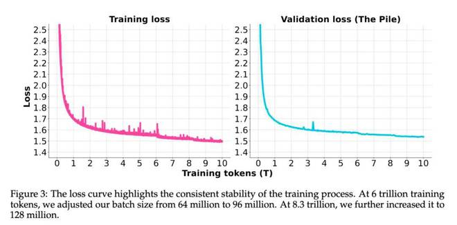 在稳定训练阶段,模型保持 3e-4 的学习率,使用 10T token 语料进行训练。为了提升训练效率,在这个阶段先后两次增加 batch size,从 64M 逐步增大至 128M,整个训练过程非常稳定,没有出现需要回滚的 loss spike。