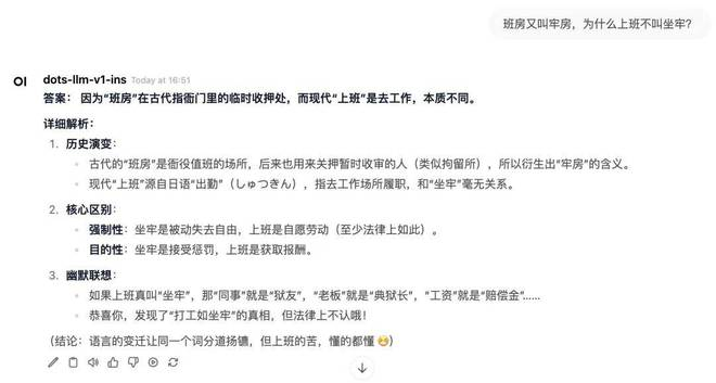 比如这道经典问题:班房又叫牢房,为什么上班不叫坐牢?dots 先从语言的历史演变、二者的区别给出正儿八经的回答,然后玩起了梗,甚至还附上表情包。