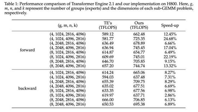 经过实测验证,与 NVIDIA Transformer Engine 中的 Grouped GEMM API 相比,hi lab 实现的算子在前向计算中平均提升了 14.00%,在反向计算中平均提升了 6.68%,充分证明了这套解决方案的有效性和实用价值。