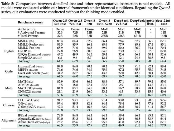 最终评测结果也令人眼前一亮:即便仅激活了 14B 参数,dots.llm1.inst 在中英文理解、数学、代码生成、对齐等任务中依然表现出色,具备与 Qwen2.5-32B-Instruct、甚至 Qwen2.5-72B-Instruct 一较高下的实力。在对比更先进的 Qwen3-32B 时,dots.llm1.inst 也在多个任务上展现出相似甚至更强的性能。