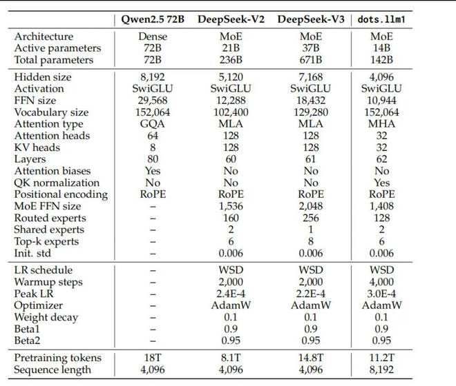 在模型设计层面,dots.llm1 是一个基于 Decoder-only Transformer 的 MoE 模型,其整体架构设计主要借鉴了 DeepSeek 系列的思路与经验。