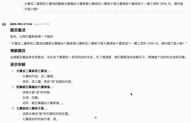 这道题目像绕口令一样七拐八绕,但 dots 并没有被迷惑,它通过逐步拆解、分析句子结构找出「偷」这个动作的执行者,最终给出正确答案。