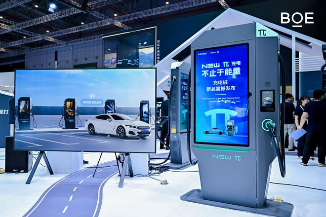 展会同期,BOE(京东方)还成功举办了一系列重要活动,邀请众多来自产业链上下游及重要合作机构的领导嘉宾出席。其中,在New π 新派充多媒体充电桩发布活动上,所发新品以“能源+媒体”双核驱动为核心理念,设计集聚商业模式创新和能量无穷无尽的概念,采用分体式柔性充电方案,最大输出功率高达250KW,配备正反面各1块55英寸屏幕及1块10.1英寸触摸屏,巧妙融合充电场景与户外数字广告场景,以“New”所代表的“新技术、新体验、新模式”有效拓展绿色能源服务生态,助力城市智慧能源网络建设。