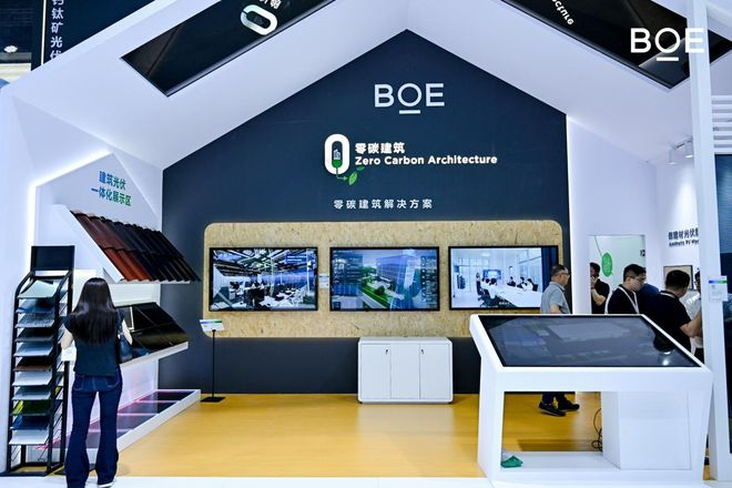 在零碳建筑展区内,BOE(京东方)展出首发的钙钛矿全场景BIPV(建筑光伏一体化)产品及解决方案,通过钙钛矿优异的发电性能,结合独特外玻处理技术,打造了模拟建材纹理的光伏艺术墙;并充分利用钙钛矿的柔性、透光性,推出光伏瓦、光伏幕墙、光伏地砖等全系列产品,提升了产品质感的同时还为建筑美学减碳提供可能。同时,BOE(京东方)展出的零碳建筑解决方案以楼宇为载体,通过物联网技术及AI智能算法相结合,实时采集楼栋能耗数据并进行调节,有效提升设备运行效率,降低运营碳排放量,助力实现零碳目标。