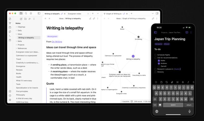 Obsidian:全平台覆盖,灵活同步方案。 Obsidian提供Windows、macOS、Linux、Android、iOS全平台客户端,笔记以开放格式存储,天然具备跨平台特性。对于同步需求,Obsidian给予用户充分自由:可以选择官方提供的End-to-End加密同步服务Obsidian Sync(付费),也可以使用自己偏好的第三方云盘(如Dropbox、坚果云等)来同步Vault文件夹。技术高手甚至能用Git版本库同步笔记。这种同步策略的好处在于用户可权衡安全与方便:官方Sync确保隐私而无需动脑,自己折腾则完全掌控数据流向。无论哪种方式,Obsidian都不强制捆绑某家云服务,也不限制离线使用。插件生态方面,Obsidian更是一骑绝尘——社区插件可以极大扩展功能,从日历、思维导图到翻译工具,应有尽有。这一切扩展均在本地运行,不受官方功能清单限制。