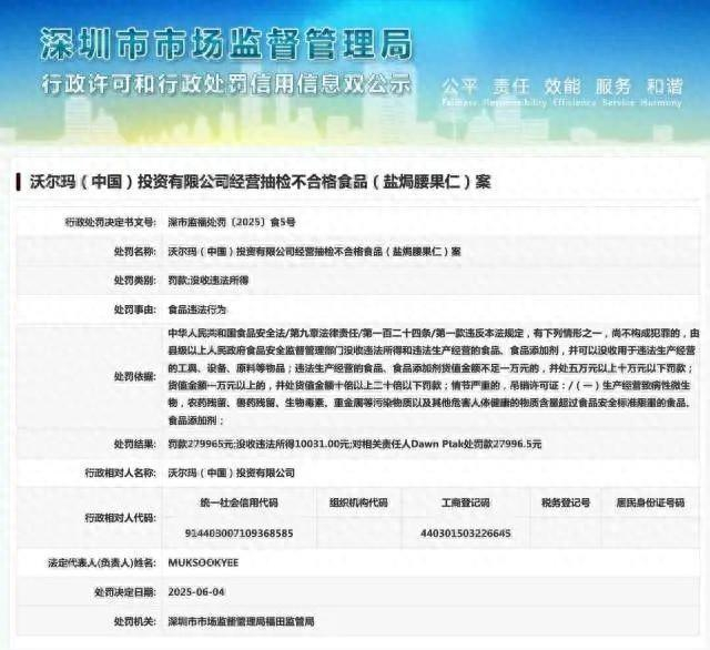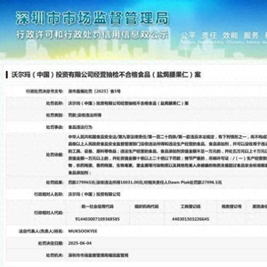 深圳市市场监督管理局网站显示,近日,沃尔玛(中国)投资有限公司,因食品违法行为被深圳市市场监督管理局福田监管局罚款279965元,没收违法所得10031元。相关责任人被罚款27996.5元。该处罚涉及沃尔玛(中国)投资有限公司经营抽检不合格食品(盐焗腰果仁)案。