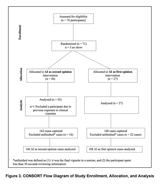 实验中有个有趣的细节:AI-second组中,48%的病例中AI的诊断和医生初始意见完全重叠,而AI-first组仅为3%。