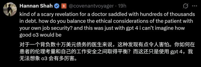 还有人表示,「对于一个背负数十万美元债务的医生来说,这种发现有点令人害怕。这还只是用GPT 4,无法想象o3会有多厉害。」