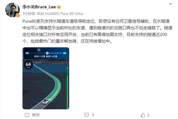 高德已可用 华为李小龙:Pura80系列支持长隧道车道级导航定位