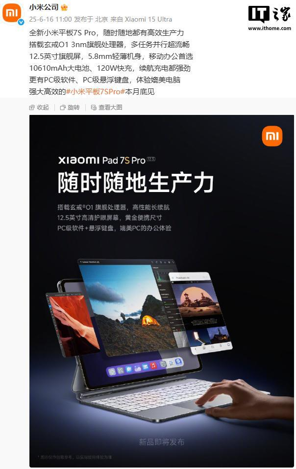 IT之家 6 月 16 日消息,小米平板 7S Pro 将于本月底发布,除了搭载玄戒 O1 3nm 旗舰处理器,小米官方还公布了更多产品规格。