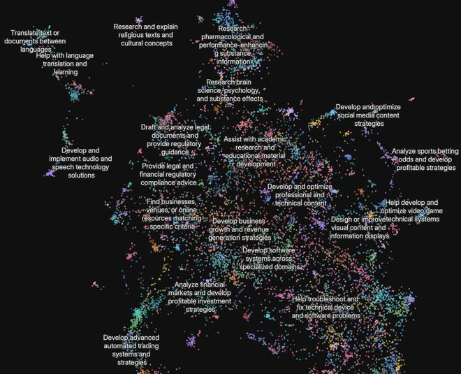 图/Clio嵌入图展示了当前用户对Research功能的主要使用方式。最常见的五大使用场景为:在专业领域开发软件系统(10%)、撰写与优化专业及技术内容(8%)、制定企业增长与营收策略(8%)、辅助学术研究与教学资料开发(7%)、以及查询与核实人物、地点或组织等相关信息(5%)。