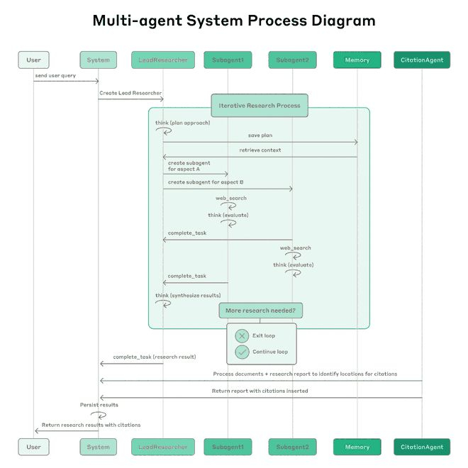 图/流程图展示了我们多智能体Research系统的完整工作流程。当用户提交查询后,系统会创建一个LeadResearcher(主研究者)智能体,进入迭代式研究流程。LeadResearcher首先思考研究路径,并将研究计划保存至Memory(记忆)以保证上下文持久存储。因为一旦上下文窗口超过200,000 tokens,超出部分将被截断,因此计划的保存尤为关键。随后,LeadResearcher会根据不同研究任务创建专业化的Subagent(子智能体)(此处仅示例两个,实际可为任意数量)。每个子智能体独立进行网络检索,通过穿插思考(interleaved thinking)评估工具结果,并将发现返回至LeadResearcher。LeadResearcher对这些结果进行综合判断,如需进一步研究,可继续创建新的子智能体或优化研究策略。当信息收集充分后,系统将退出研究循环,并将所有研究结果交由CitationAgent(引文智能体)处理。CitationAgent会对文档和研究报告进行分析,标注具体引用位置,确保所有论断均有明确信息源支撑。最终,带有完整引文的研究结果返回给用户。
