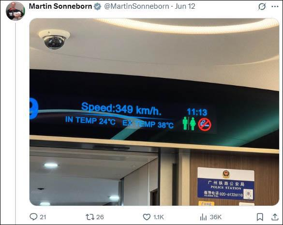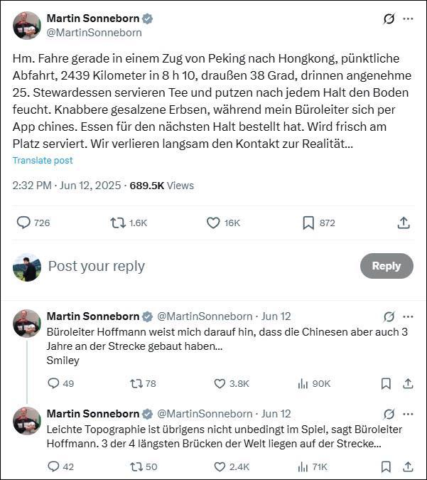 索内伯恩在X平台上分享中国高铁之旅