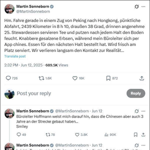 还有人模仿索内伯恩的句式讽刺起来:“我此刻正坐在从科隆开往柏林的高速列车上。晚点37分钟,空调坏了,理论上只有头等舱才有无线网络。我花4.9欧元买了个奶酪面包,明天就要过期了。我的助理正在餐车里跟服务员交涉。咱这趟旅程可真是‘一帆风顺’啊!”