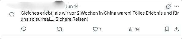 “两周前我们在中国时也经历了类似的事!超棒的体验,对我们来说简直像做梦一样…… 祝你旅途平安!”
