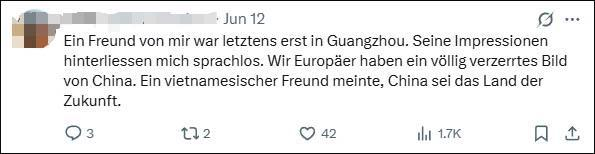 “我有一位朋友最近去了广州,他的所见所闻让我哑口无言。我们欧洲人对中国的认知简直是完全扭曲的。一位越南朋友曾说过,中国是属于未来的国家。”