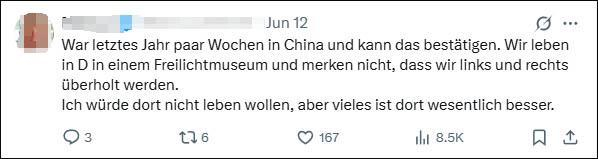 “去年曾在中国小住数周,对此深有体会。我们德国简直像个露天博物馆,浑然不觉正被东西两侧的国家超越。虽然我不会在中国定居,但那里的许多事物确实先进得多。”